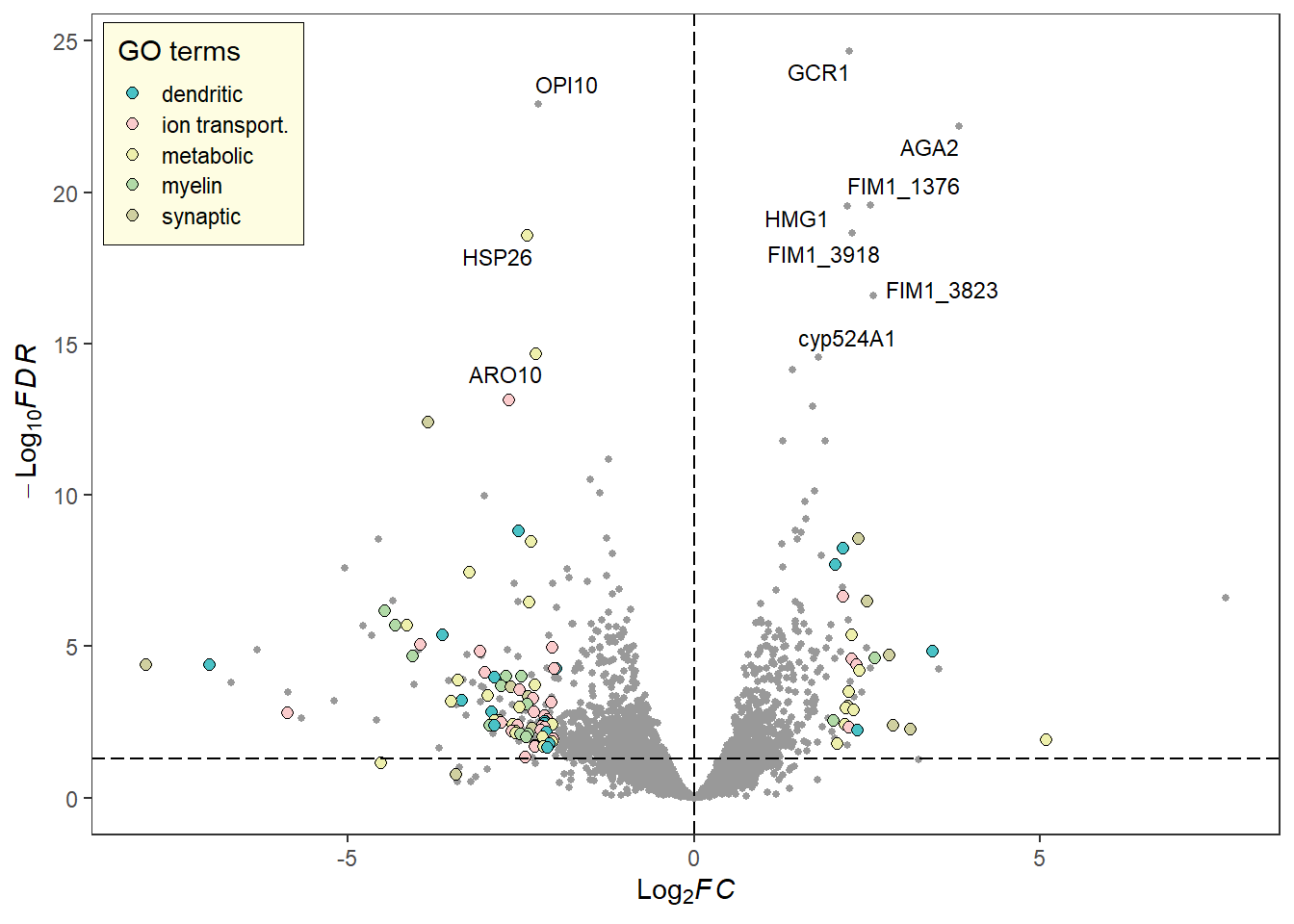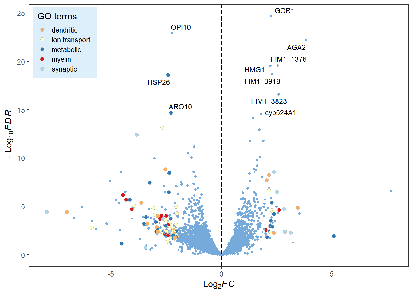 library(RColorBrewer)# Change the fill and color manually:deg_point_fill <-brewer.pal(5, "RdYlBu")names(deg_point_fill) <-unique(term_data$term)term_volcano(data, term_data,x ="log2FoldChange", y ="padj",normal_point_color ="#75aadb",deg_point_fill = deg_point_fill,deg_point_color ="grey",legend_background_fill ="#deeffc",label ="row", label_number =10, output =FALSE)